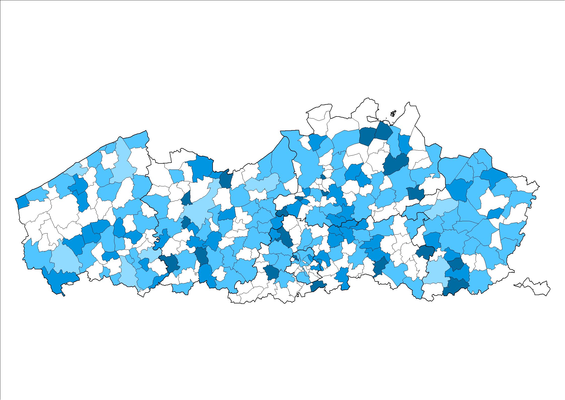 De variatie onder de Vlaamse partijen is voor een deel te wijten aan organisatorische aspecten: niet elke partij kent een even sterke en evenwichtige lokale verankering over alle Vlaamse gemeenten. Het is dan ook niet meer dan normaal dat bepaalde partijen het moeilijker hebben om een volwaardige geografische spreiding te realiseren. Het verschil tussen N-VA en SLP bij Figuur I is wat dat betreft frappant. N-VA kan als (relatieve) nieuwkomer een spreiding over het grondgebied realiseren die niet hoeft onder te doen voor de traditionele partijen. SLP beperkt zich grotendeels tot de stedelijke centra. Maar partijen kunnen ook los van organisatorische redenen van elkaar verschillen. Zo heeft de ene partij misschien een meer uitgesproken stedelijk karakter, terwijl de andere eerder tracht de vertegenwoordiging van de landelijke streken te accentueren. De vergelijking tussen sp.a en Open Vld, toch twee partijen met een lange geschiedenis, laat ook verschillen optekenen. Meer dan liberalen, rekruteren de socialisten vooral uit (groot)stedelijke gebieden. De kaart van sp.a laat ook meer ‘blinde vlekken’ zien dan de liberale tegenhanger.